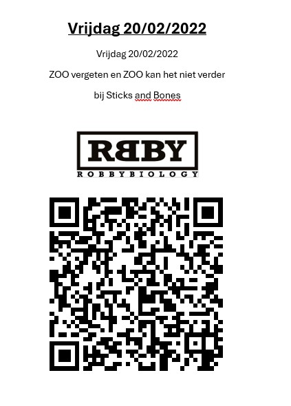 Binnenkort koppelen wij (ROBBYBIOLOGY en STICKS AND BONES Art Concepts) ons aan een mooi theaterstuk genaamd "ZOO vergeten" over de zoo van zwartberg. Om de locatie en het voorprogramma (ca 1u met tijd voor uitweiding) uit te testen doen wij een try-out waar je vriendelijk bij uitgenodigd bent na ons een seintje te geven (mail naar Robbybiology@gmail.com) of stuur een berichtje.